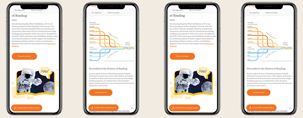 The result was a fundamental transformation in how Amplify could share their educational vision online. The custom search functionality turned the website into an active sales tool, making it effortless for educators to discover, sample, and advocate for Amplify’s programs. The new platform combines elegant design with powerful functionality, giving Amplify the freedom to showcase their programs dynamically as their educational impact expands. What was once a cumbersome publishing process became a powerful vehicle for connecting with educators and advancing learning nationwide.